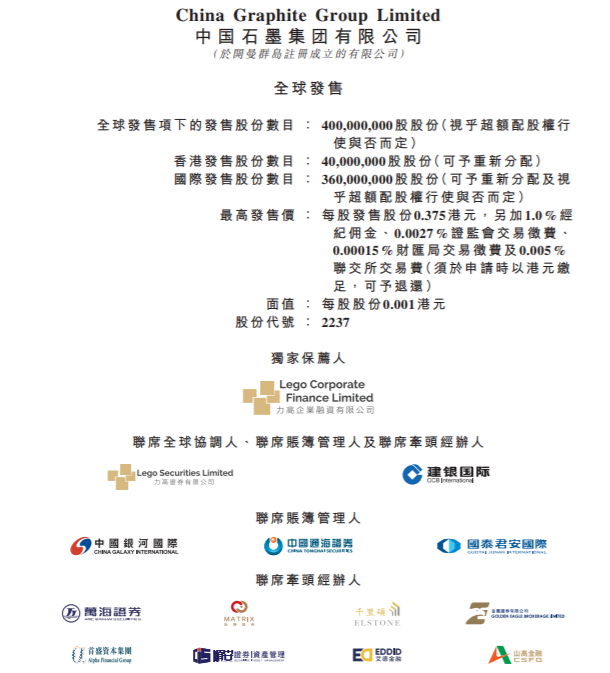 6月30日,中国石墨发布公告,将于6月30日至7月8日招股,公司拟发行4亿股股份,其中公开发售4000万股,国际发售3.6亿股,每股发行价0.325港元-0.375港元,每手1万股,预期将于7月18日上市。申购阶梯: