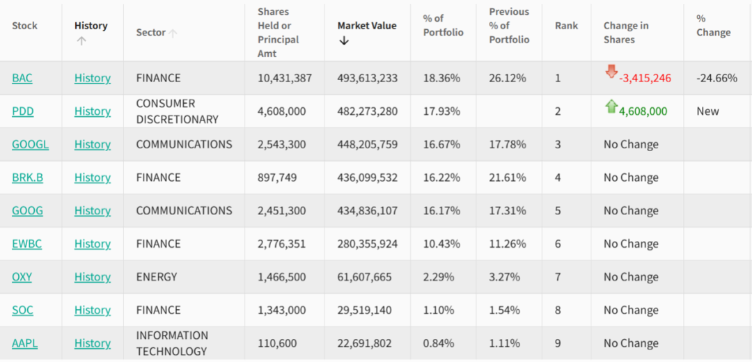 值得注意的是,李录在投资上深受芒格和巴菲特的影响,其持仓十分简洁、干净,仓位高度集中于几家公司。截至二季度末,喜马拉雅资本的持仓公司数量共有9家,分别是美国银行、拼多多、谷歌、伯克希尔哈撒韦B股、华美、西方石油、SOC、苹果。