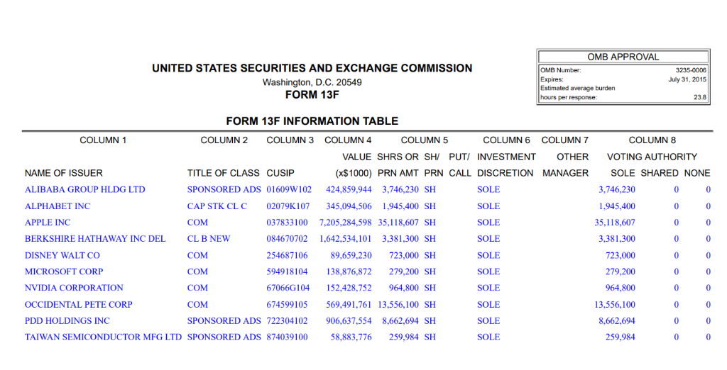 报告显示,该机构的总持仓市值达到115.3亿美元。截至6月30日,段永平的投资组合中,苹果公司以高达72亿美元的持仓市值占据了绝对核心地位,占整个投资组合的比例超过62%。紧随其后的是巴菲特的伯克希尔哈撒韦,占比约14.2%。其次为拼多多(7.86%)、西方石油 (4.94%) 和阿里巴巴集团控股-SP ADR (3.68%)。