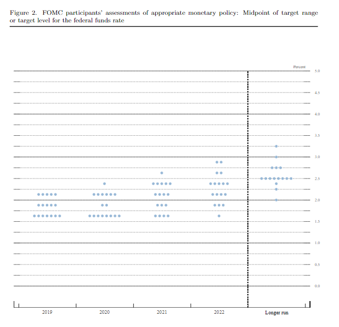 点阵图显示美联储年内不再降息,但17名委员中有7名认为还将降息一次。此外,点阵图显示2020年预期没有降息,2021年和2022年各有一次降息。