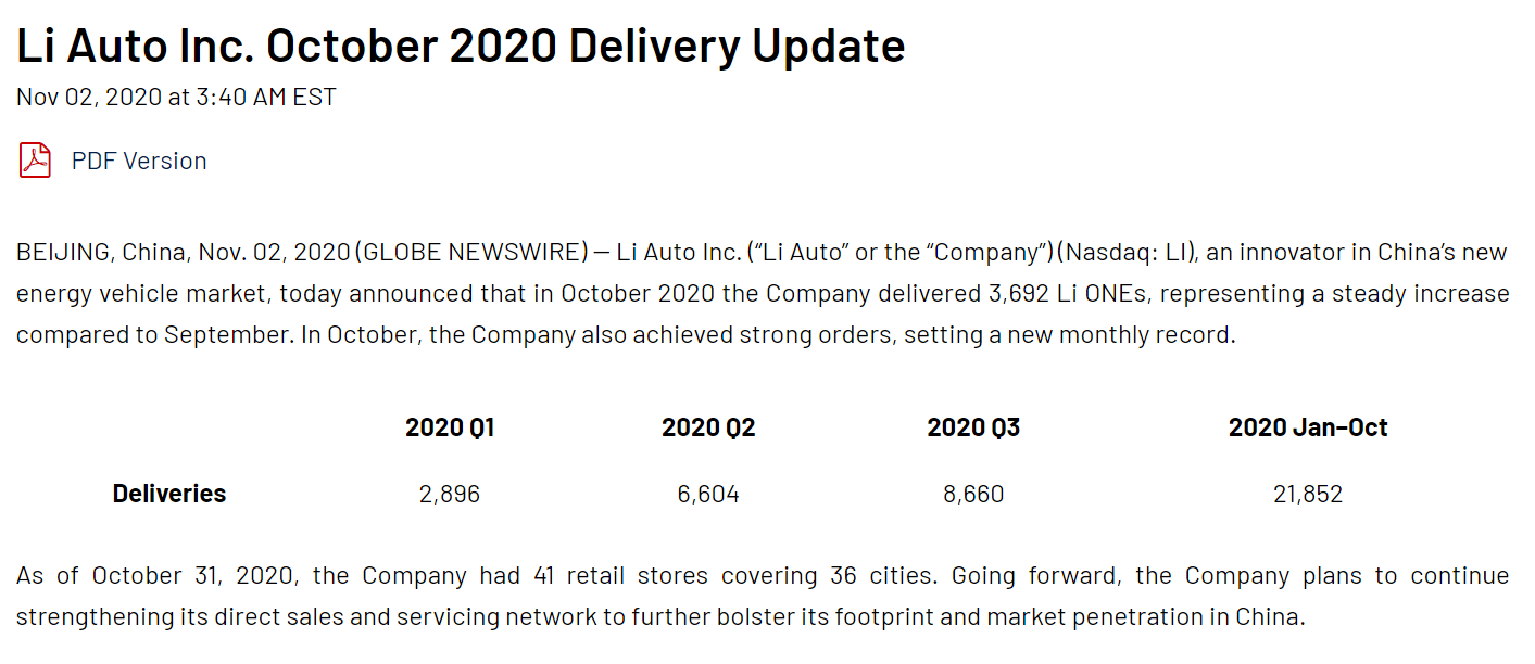 理想汽车:10月份交付3692辆理想ONE,创下月度交付记录;今年1-10月共交付21852辆汽车。
