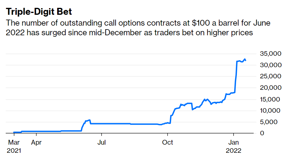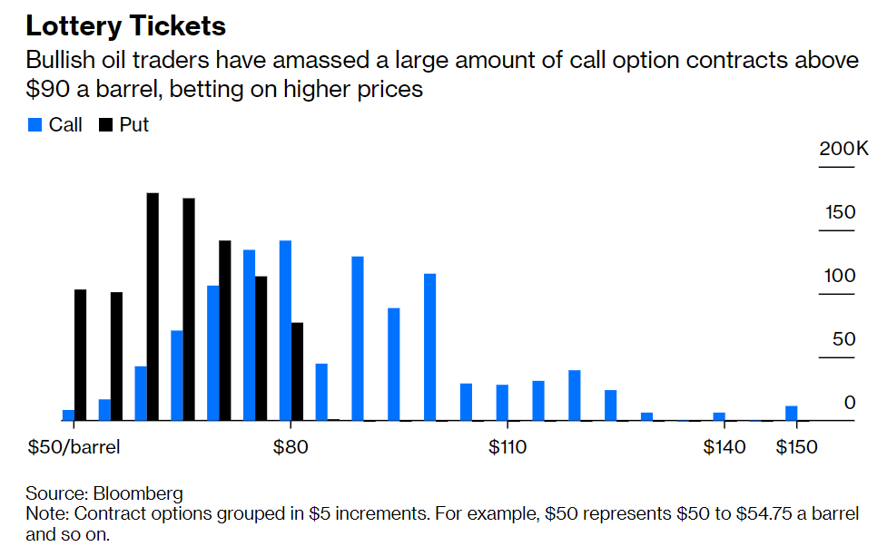在新冠疫情最严重的时候,这些期权几乎是不要钱白送。在当时严格的封锁措施和疲软的能源需求之下,油价飙升至三位数水平似乎是天方夜谭。