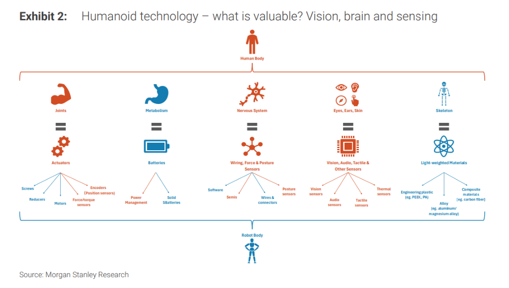 大脑技术(Brain Technology): 这是人形机器人的核心,主要包括AI软件和半导体,如强大的GPU、ASIC或专用边缘计算设备。这些技术是机器人实现感知、决策和通信功能的中枢。报告认为,由于最终赢家尚不确定,投资于“领先的先进制程晶圆代工厂商”是参与该领域的一种稳妥方式。