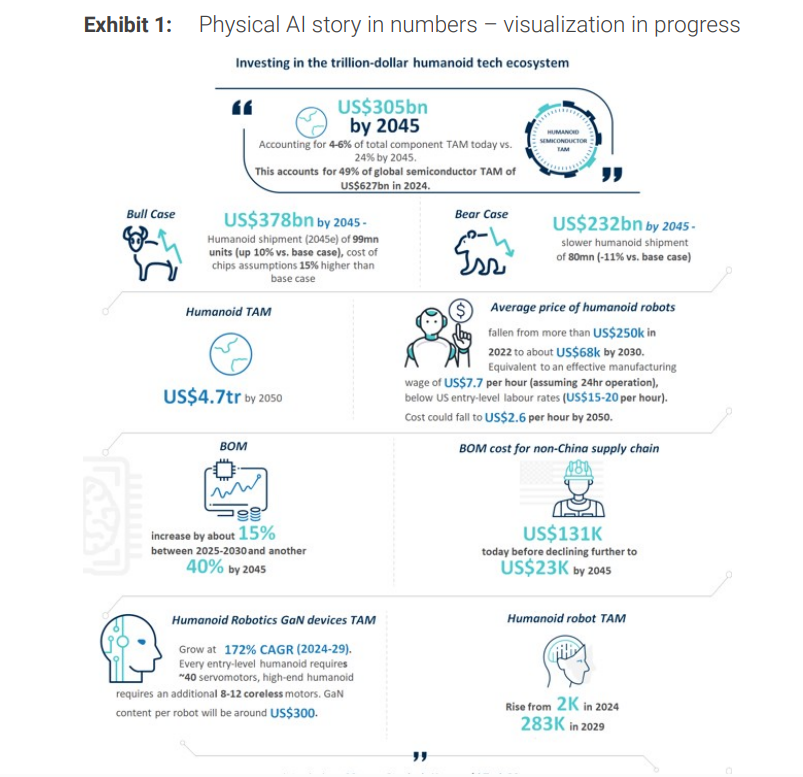 报告测算,随着单台机器人的物料清单(BOM)成本从约13.1万美元降至2045年的2.3万美元,半导体在BOM中的成本占比将逆势大涨,从目前的个位数飙升至24%。