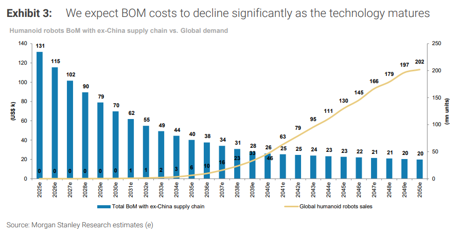 这主要是因为,尽管传感器等其他组件的成本会随着技术成熟而下降,但每台机器人所需的计算强度将持续增加,从而推高了AI处理器等核心芯片的价值。