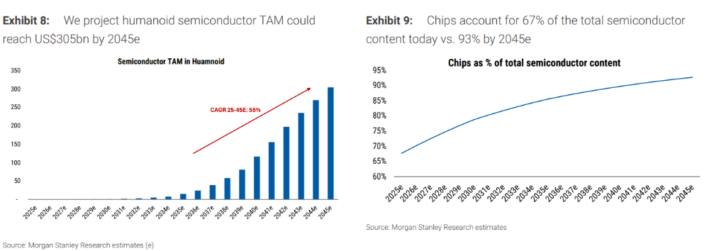 在人形机器人的价值构成中,半导体正扮演着越来越重要的角色。摩根士丹利在报告中将焦点从机器人整机转向了其内部的半导体价值。