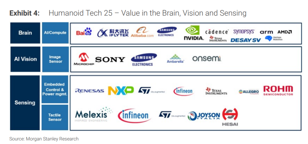 大摩预测,随着人形机器人单机成本从当前13.1万美元降至2045年的2.3万美元,半导体在物料清单中的占比将从4%-6%激增至24%,催生超3000亿美元半导体市场。而行业真正价值向上游“大脑”(计算芯片)、“视觉”(图像传感器)和“传感”(模拟芯片)三大核心赛道集中,AI处理器更将占半导体成本约93%。