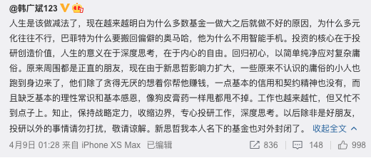 巧合的是,就在明汯陷入市场传言的同期,深圳知名私募新思哲的创始人韩广斌在微博和朋友圈对外宣布封闭自己名下的基金,称“投资的核心在于投研创造价值,人生的意义在于深度思考,在于内心的自由”、“知止,保持战略定力,收缩边界,专心投研工作,深度思考。”