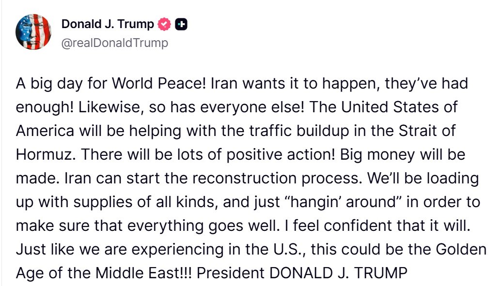 4月8日,美国总统特朗普:世界和平迎来了重要的一天!伊朗也希望实现和平,他们已经受够了!其他各方也一样!美国将协助处理霍尔木兹海峡的船只拥堵问题。将会有许多积极的行动!将赚取巨额资金。