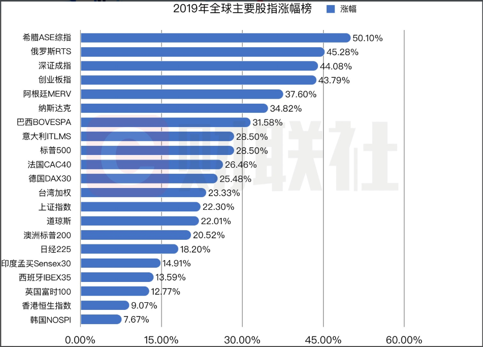 12月31日讯,沪深两市2019年平稳收官,沪指全年涨22.30%,深成指全年大涨44.08%,创业板指全年大涨43.79%。截至目前,在全球主要股指中分别位列第十三、第三、第四。