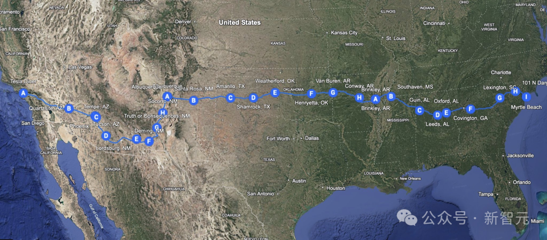他从洛杉矶的特斯拉餐厅出发,最终到达南卡罗来纳州默特尔海滩,穿越了24个州。