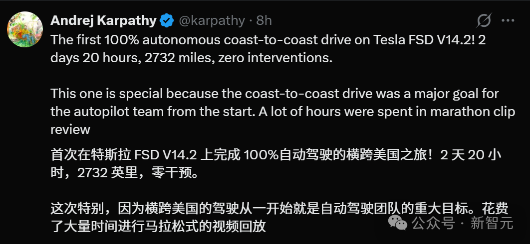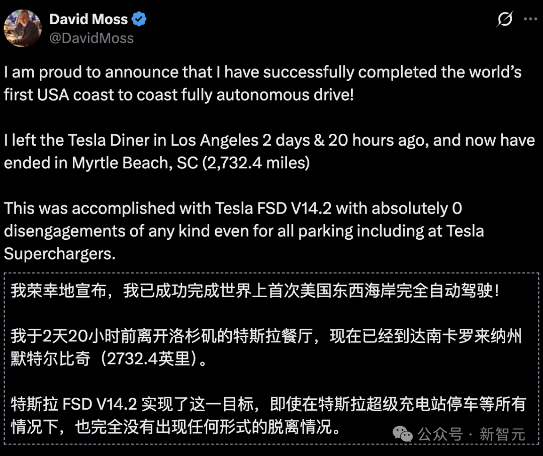 他驾驶搭载FSD V14.2的Model 3,完成了全球首次、经由第三方数据验证的「零接管」横贯美国之旅。