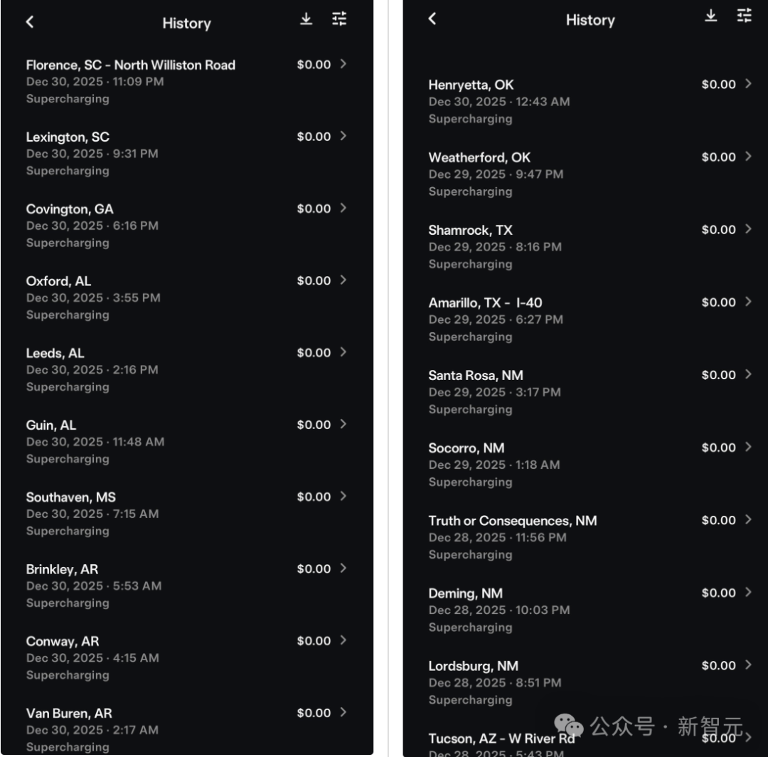 同时,David Moss晒出了充电记录。注意,在所有站点的停车,也都是由特斯拉FSD自动完成的。