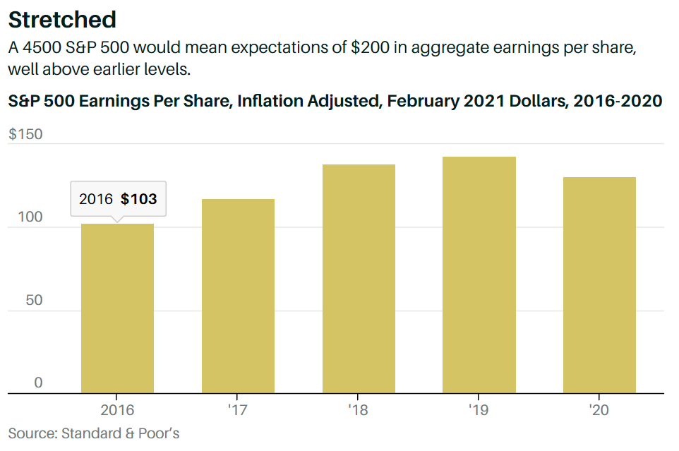 Maybe, if everything goes right. President Biden’s $4 trillion infrastructure bill would have to pass without big hikes to corporate and capital-gains taxes to finance it. The pandemic would have to be a nonissue by summer. Inflation would have to be minimal, limiting pressure on the Federal Reserve to keep interest rates low. Earnings estimates would have to rise, and valuations remain high.