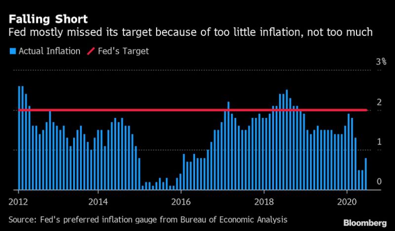 美联储先是在2012年宣布将通货膨胀率目标设定为2%,而官员们则表明这意味着无论他们距离目标有多远,错过目标的时间有多久,他们都将始终坚持实现2%的目标。但是美联储青睐的通货膨胀指标一直未能实现目标,自引入通胀目标以来的通胀率平均仅1.4%。