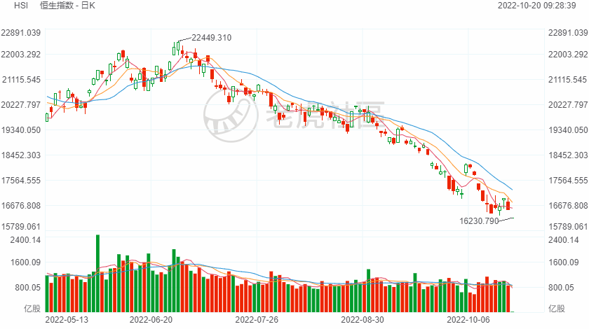 10月20日讯,隔夜欧美股市下跌,中概股指数创逾9年来收盘新低。港股今日大幅低开,恒指跌1.7%,国指跌1.87%,恒生科技指数跌3.3%,三者再度刷新调整低价。
