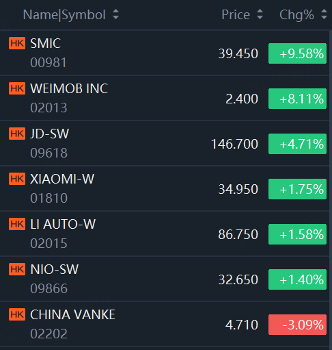 Weimob rose 8%; Xiaomi rose 1.75%; Li Auto rose 1.6%.
