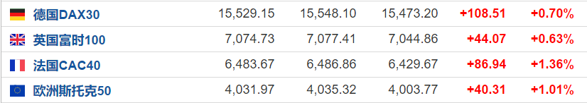 欧洲主要股指走高,德国DAX30涨0.7%,英国富时100涨0.63%,法国CAC40涨1.36%,欧洲斯托克50涨1.01%。