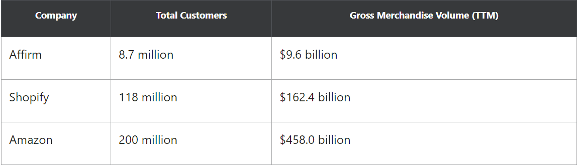 DATA SOURCE: AFFIRM, SHOPIFY, AMAZON. TTM = TRAILING TWELVE MONTHS.