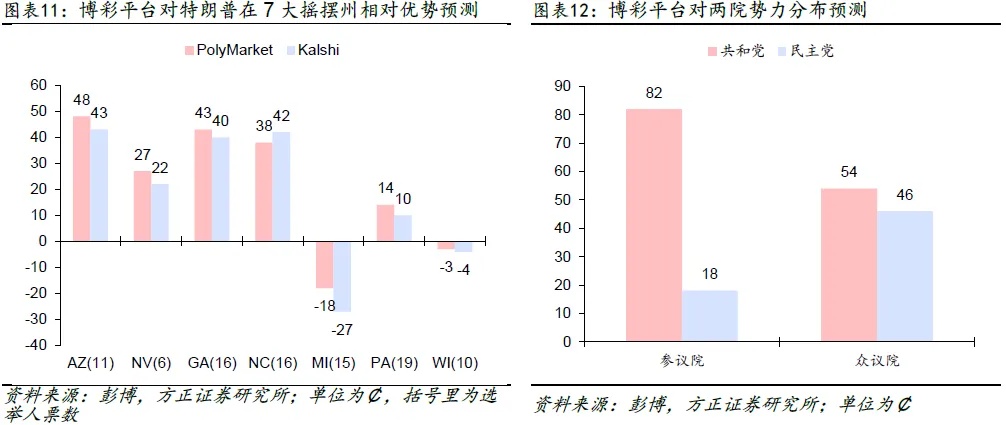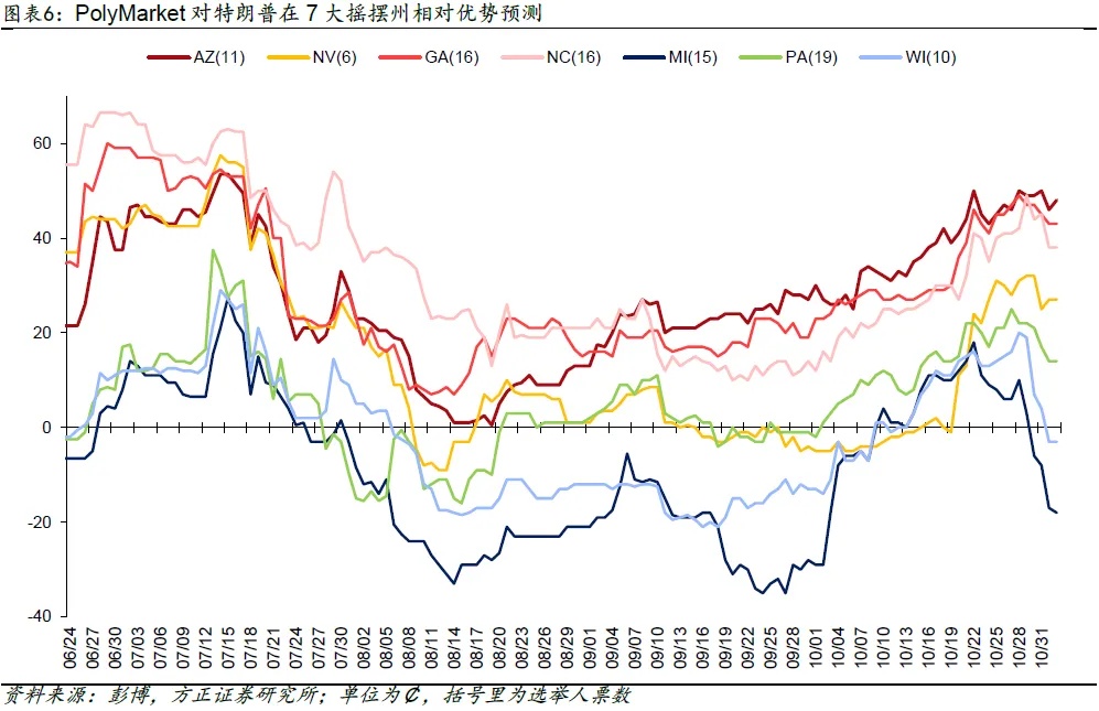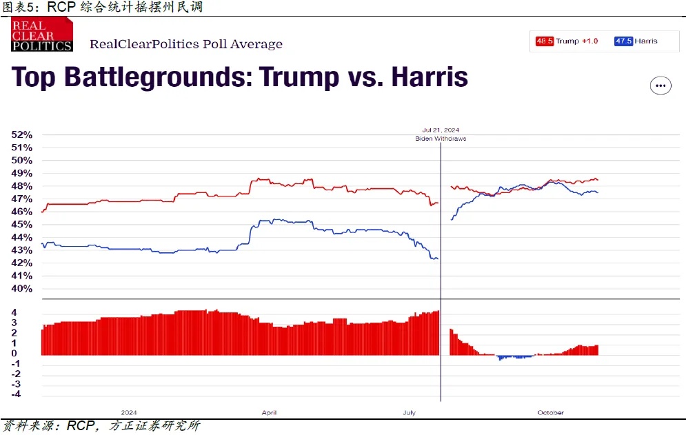 选情更新:特朗普综合民调小幅反超,摇摆州竞争持续白热化。在民调数据方面,RCP调查显示,特朗普以48.4%的整体支持率小幅反超哈里斯的48.1%,领先+0.3%。在七大战场州中,特朗普在佐治亚州(GA,共计16张选举人票)和亚利桑那州(AZ,共计11张选举人票)优势较为明显,领先幅度大于2%;而在其余各州中,特朗普与哈里斯的支持率仍然焦灼,两位候选人互有高低,且差距仍小于1%。本周,密歇根州(MI,共计15张选举人票)、威斯康星州(WI,共计10张选举人票)和宾州(PA,共计19张选举人票)的选情出现一定的反转,哈里斯小幅领先,这或与哈里斯在最近重返当地并进行竞选活动有关。在竞选活动方面,哈里斯与特朗普及其各自代表纷纷涌入威斯康星州这一关键战场,展开最后的拉票攻势。在竞选的最后阶段,哈里斯将目标锁定在了温和的郊区女性,特别是那些未受过大学教育的白人女性,希望通过提高女性投票参与率来获得更多选票。在大选博彩方面,特朗普的优势相较于民调数据上更为领先,但近日其优势有所回落。Polymarket平台上特朗普、哈里斯的赔率分别为57.7¢、42.3¢;RCP博彩平台综合数据显示特朗普领先19.6¢,较前半周有所回落。摇摆州方面,Polymarket和Kalshi两个平台数据显示,特朗普在密歇根和威斯康星州已落后,在宾州的领先优势也并不显著。国会选情方面,上述两个平台上,共和党横扫(Republican Sweep)的赔率分别为38¢和39¢,仍为最有可能的总统+国会选举结果组合。值得注意是,10月30日至11月1日,伴随特朗普在博彩平台上的碾压性优势开始回落,特朗普旗下DJT股价出现大幅下挫,美债利率和美元指数一度回撤,市场波动性加剧。从基本面看,民主党更积极的提前投票、特朗普对摇摆州舞弊的控诉都让市场开始重新定价大选的不确定性风险。交易层面,大选风险的重新定价则导致了两个问题:“特朗普交易”的阶段性止盈和大选前高波动性环境中仓位下降带来的流动性冲击,这导致虽然特朗普交易降温,但美债利率随后延续上行。就大选选情而言,民调的焦灼、大选博彩的调整,以及市场波动的加剧均显示此前特朗普的碾压式竞选优势或存在一定偏差,“哈里斯冲击”并非小概率事件,其结果仍然有待开票结果的确认。