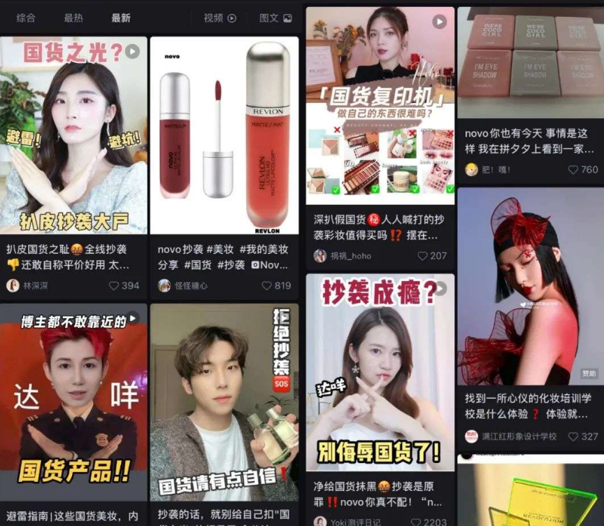 通过小红书、B站等平台搜索完美日记+平替的关键词,会发现大量模仿或抄袭完美日记爆款商品的品牌,有的甚至在包装设计和色号上与完美日记做到了一模一样。