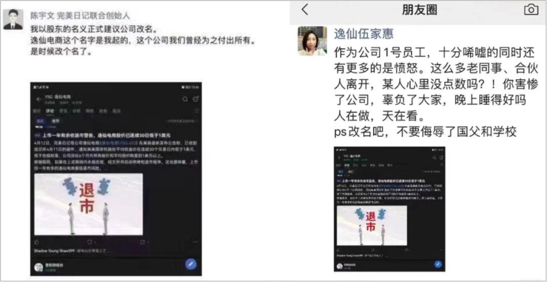 此次逸仙电商收到退市警告后,陈宇文与逸仙电商一号员工伍家惠分别在其朋友圈发表了关于自己的看法。