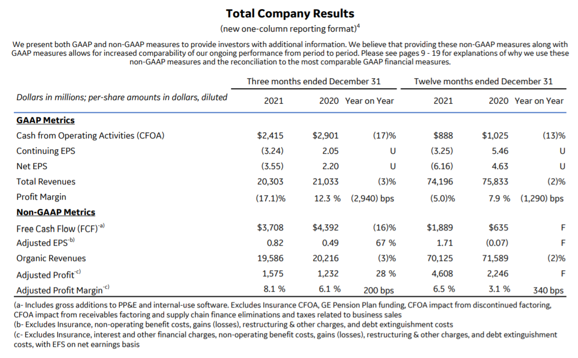 1月25日,通用电气发布2021年第四季度业绩。财报显示,第四季度营收203.03亿美元,市场预期215.29亿美元,去年同期219.28亿美元;第四季度净亏损39亿美元,市场预期净亏损1.49亿美元,去年同期净利润24.42亿美元;第四季度调整后每股盈利0.92美元,市场预期0.85美元。