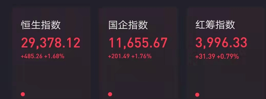 2月2日(周二)港股开盘,恒生指数上涨485.26点,涨幅1.68%,报29378.12点;国企指数上涨201.49点,涨幅1.76%,报11655.67点;红筹指数上涨31.39点,涨幅0.79%,报3996.33点。