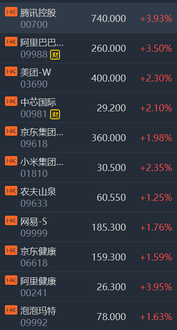 恒生科技指数涨2.26%,腾讯涨3.93%,阿里健康涨3.95%,阿里巴巴涨3.5%,舜宇光学科技涨2.1%,小米集团涨2.35%,美团涨2.3%。