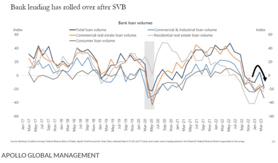 阿波罗全球管理公司首席经济学家Torsten Slok表示,信贷紧缩的影响已经显现。他在周四发表了一份题为《信贷紧缩已经开始》的说明。