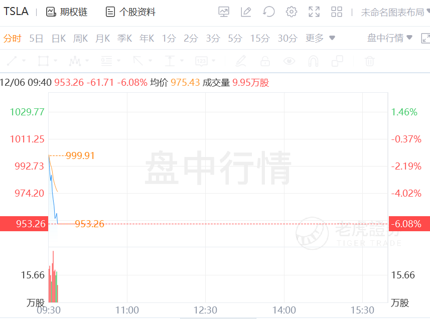 【异动】特斯拉股价跌幅扩大至6%,再度失守1000美元关口