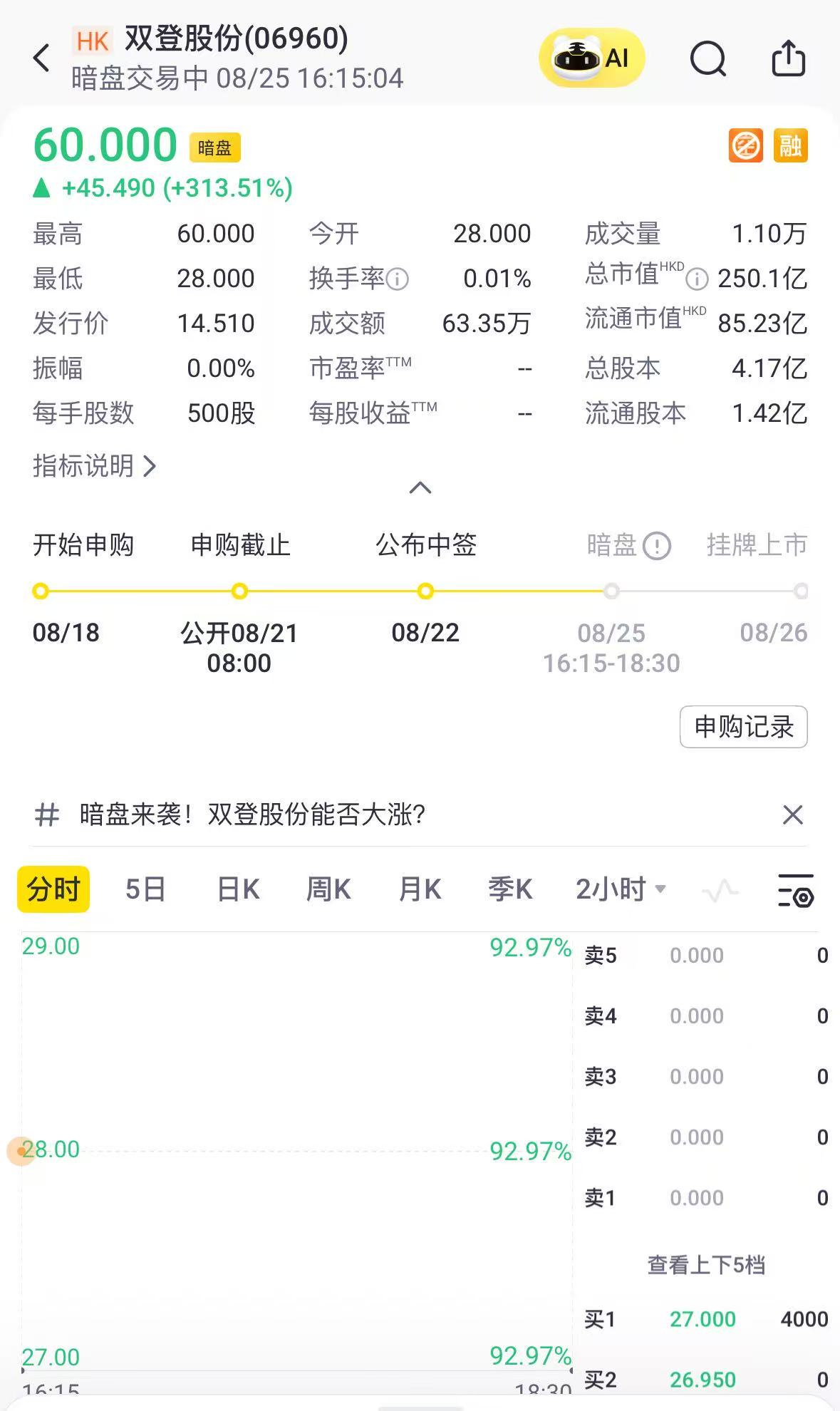 8月25日,双登股份暗盘涨超310%,总市值超250亿港元;不计手续费,中签一手赚超22700港元;公司每股定价14.51港元,每手500股,将于8月26日(周二)正式挂牌交易。