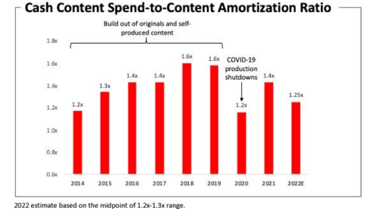 奈飞表示,"由于收入增加,盈利能力稳固,以及我们的内容模式多年来的成功演变",其将继续把服务从授权内容转变为自身的原创内容。从其资产负债表来看,60%的净内容资产是Netflix原创内容。因此,其现金内容支出与内容摊销费用比率达到了1.6倍的峰值,预计在2022年全年达到约为1.2-1.3倍,并在未来逐步下降。