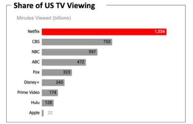 奈飞表示其电视收视份额在6月份增长到了7.7%的历史新高,并达到13亿分钟的收视率,几乎与排名第二第三的两大媒体巨头CBS和NBC的总和等量。