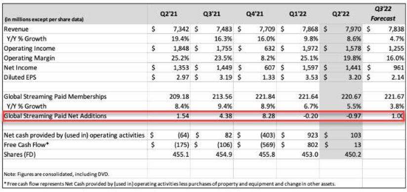 - 第二季度流媒体订阅用户数减少97万,远远低于分析师预期减少200万,目前累计用户达2.2067亿。