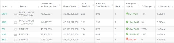 在前五大重仓股中,微软位列第一,持仓约7842.09万股,持仓市值为184.89亿美元,较上季度持仓数量增加了11%,占投资组合比例为2.08%。