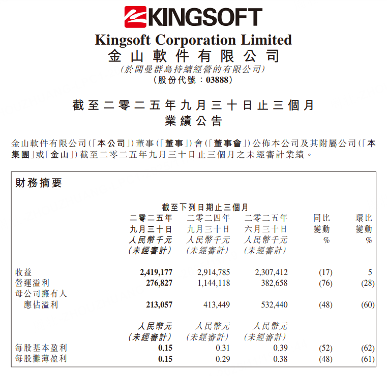 发布2025年第三季度业绩。财报显示,第三季度营收24.2亿元,预估26.3亿元;第三季度净利润2.13亿元;第三季度毛利率80%,市场预估80.4%。