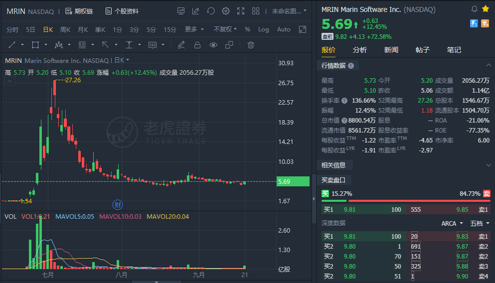 At the time of publication, shares of Marin Software were trading 72.58% higher during premarket trading Wednesday. The stock has a 52-week low of $1.18 and a 52-week high of $27.26.