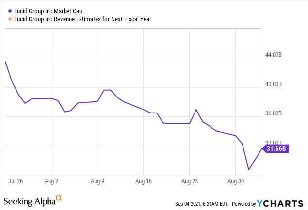 Depending on what buzz Lucid generates at the marketing event in September, Lucid could see a strong increase in reservations as most people are likely still unaware of the premium electric sedan model Lucid offers. Assuming that Lucid, five years out, sells an amount of EVs that approximates the firm’s manufacturing capacity, about 50,000 vehicles annually, the EV maker could generate yearly revenues of $3.5B. This calculates to a market-capitalization-to-sales-ratio of 9.0x... which is not an outrageously high sales multiplier factor to pay for EV-related sales growth.