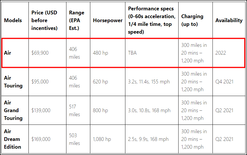 Lucid could make a splash with its first ever EV product which is expected to roll off factory belts in the coming months. While Lucid also invests in energy storage solutions, the focus of this article is on Lucid’s first production car, the Lucid Air… which could help the EV maker establish itself as a force to be reckoned with in the luxury EV segment. Lucid Air is an all-electric sedan with 480 hp, with a top speed of 168 mph and a projected travel range, for its base version, of approximately 400 miles.