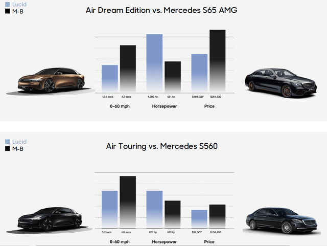 One strong selling point that differentiates Lucid from other electric vehicles is the combination of luxury and performance aspects in the under-served premium sedan market. Compared against other models in the premium sedan segment, for example models from Mercedes, Lucid offers a better cost-value relationship: The Lucid Air is cheaper than comparable luxury sedans from Mercedes, including AMG versions, while offering competitive performance. The combination of performance and value could help Lucid establish itself as a luxury green-energy alternative to other premium sedans.