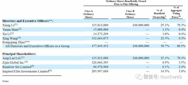 Yanan Shen持股1.1%,拥有0.4%投票权;Tie Li持股为1%,拥有0.4%的投票权;Rainbow Six Limited持股为6.1%,拥有2.4%投票权;