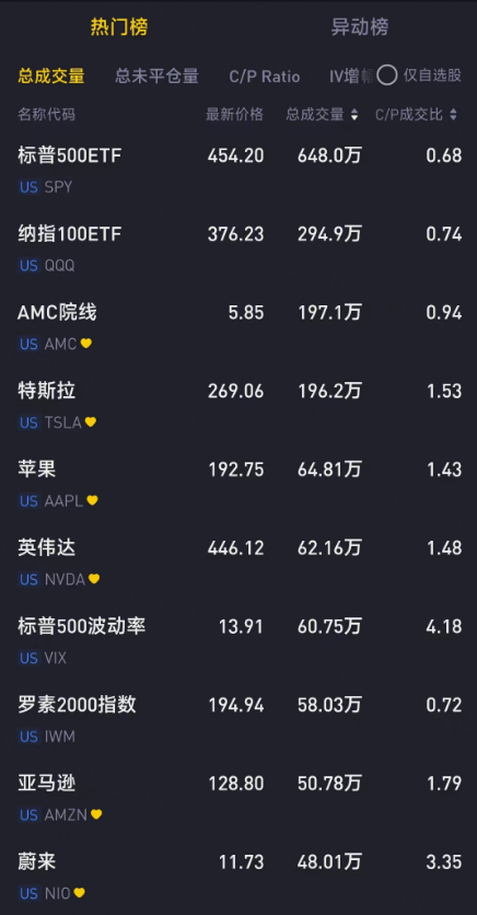 当日美股期权市场总成交量35,817,772张合约。其中,看涨期权占比57%,看跌期权占比43%。