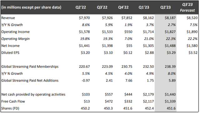 截至二季度末,奈飞的全球流媒体付费用户数为2.38亿,同比增长8%,增速显著高于之前几个季度;环比净新增付费用户数为589万,不仅明显高于一季度的水平,也远远高于市场预期的207万,还创下疫情以来最佳的第二季度用户增速。付费用户数实现连续四个季度的环比净增长。