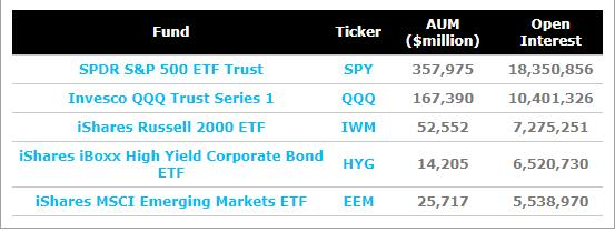 iShares MSCI Emerging Markets ETF (EEM)、SPDR Gold Trust (GLD)和 Financial Select Sector SPDR Fund (XLF)是其他一些拥有活跃期权市场的庞然大物。