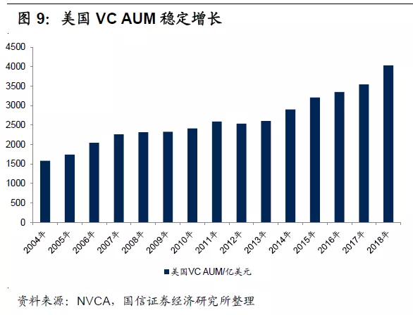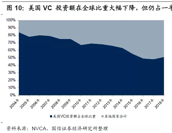 硅谷银行之所以能从事这类特殊金融业务,与美国发达的风险投资行业不无关系,即有了相应的需求,才有硅谷银行的发展。根据National Venture Capital Association(NVCA)数据,2018年全球VC(注:NVCA所称的VC包括了PE)投资规模达到2540亿美元,其中美国1310亿美元,占比约50%(2004年这一比例更是高达84%)。