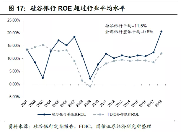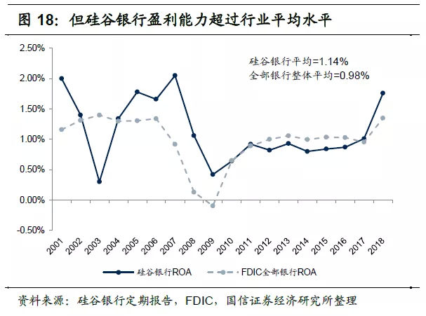 从最终财务结果来看,与行业平均水平相比,硅谷银行的盈利能力也更强,其2001年以来的ROE、ROA平均水平都高于行业整体。
