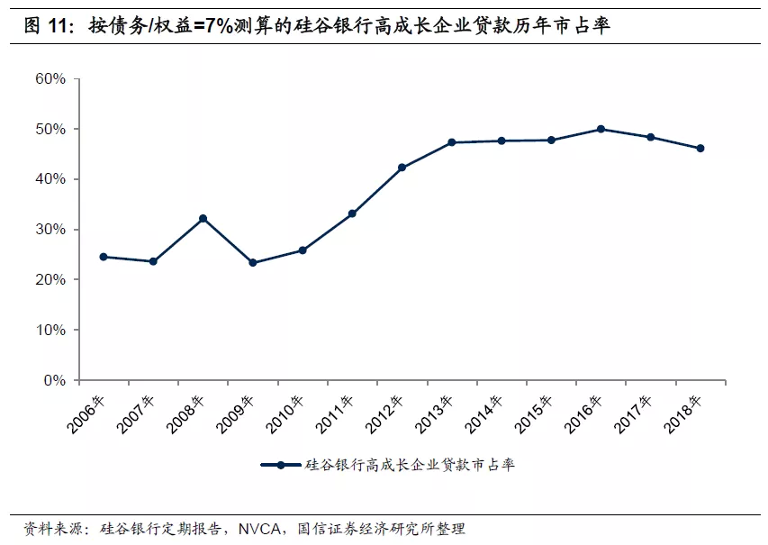 不过从另一个方面来讲,硅谷银行这么小的总资产体量就已经达到了接近一半的市占率,说明这是一个空间不大的“利基市场”。从历史数据来看,按照高成长企业的债务/权益为7%的假设推算,硅谷银行在高成长企业贷款中的市占率自2013年之后基本稳定在50%左右,而后其贷款则越来越倾向于直接投给PE/VC。