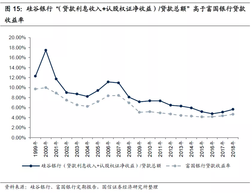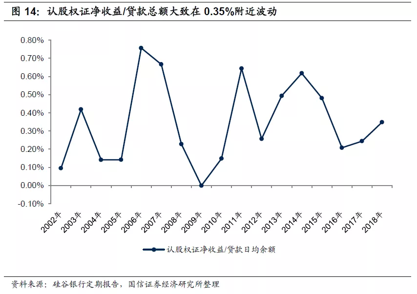 认股权证的公允价值变动、行权收益或到期未行权损失合并计入认股权证净收益,这部分净收益波动性很大,但2001年之后年均约占贷款总额的0.35%。我们可以将这部分用于进行风险补偿的非息收入视为贷款利息收入,进而计算硅谷银行的综合贷款收益率。