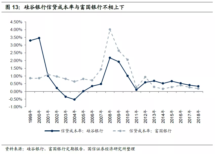 硅谷银行通过长期专注于高成长企业贷款,在这一大家普遍认为风险高的行业取得了良好的风控效果。与另一家经营稳健的大型商业银行富国银行对比,我们发现硅谷银行的信贷成本率与富国银行不相上下。